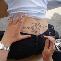Jedes Kind oder jeder Erwachsene kann vor Ort, aus einer bereitliegenden Mappe mit einer gossen Ansammlung an Tattoo-Motiven, von Chinesischen Schriftzeichen, Sternzeichen, Keltischen Motiven, Figuren bis zu Kunstvollen Ornamenten ein handgemaltes Tattoo selbst auswählen, das in nur 1 bis maximal 8 Minuten je nach Motiv fertig ist. |